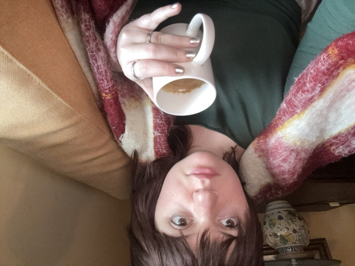 A woman with brown hair and a nose ring holds a white mug with coffee in her right hand. She is reclining, with an arm draped in a red and white patterned blanket. She wears a dark green shirt. In the background, a section of a tan couch and a decorative lamp are visible. The woman has silver nail polish and two silver rings on her fingers.