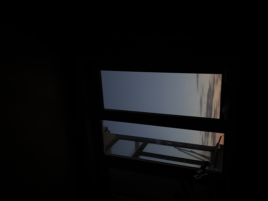 The image depicts a view from a darkened interior looking outward through a multi-pane window, reportedly located in Izhevsk, Russia. The majority of the frame, encompassing the interior space surrounding the window, is rendered in deep shadow, obscuring any discernible internal details. The window itself features dark-colored frames. Through the left window pane, a partial exterior view reveals a vertical structural element, likely part of an adjacent building or balcony, with visible reflections on the glass surface. The right window pane provides a clear vista of a twilight sky. The sky progresses from a deep blue overhead to lighter blue and subtle orange-pink hues along the horizon, indicative of dusk or dawn. Several thin, elongated cloud formations are present in the lower portion of the sky. No individuals, animals, vehicles, or specific architectural landmarks are observable within either the visible interior or exterior environments.
