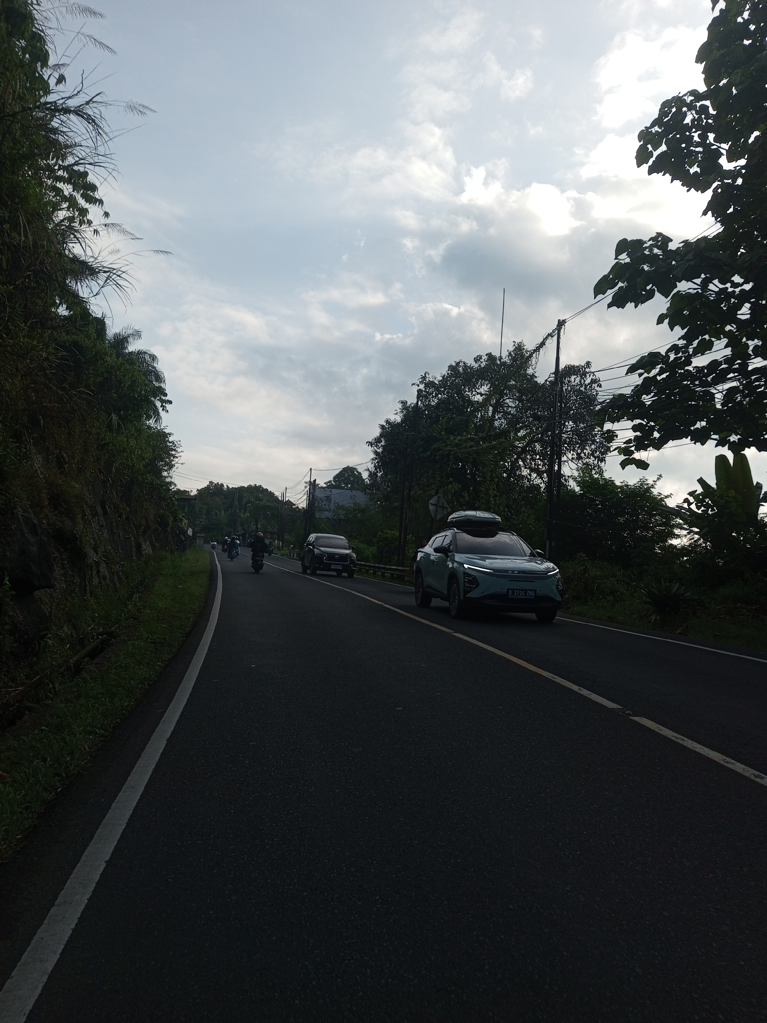paved two-lane road in a rural area, likely in the vicinity of Mya Sit Kaing Ywar Thit, Myanmar. The road curves to the left. A light blue car with a roof rack is driving on the right lane, followed by a dark SUV and two motorcycles further ahead. Dense vegetation lines both sides of the road, with a steep embankment on the left and taller trees on the right. Power lines are visible overhead. The sky is overcast with some patches of bright sunlight. A white line marks the edge of the road on the left.