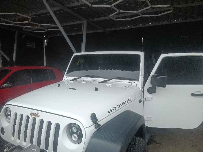 A white Jeep Rubicon with an open driver's side door is partially visible under a carport-like structure