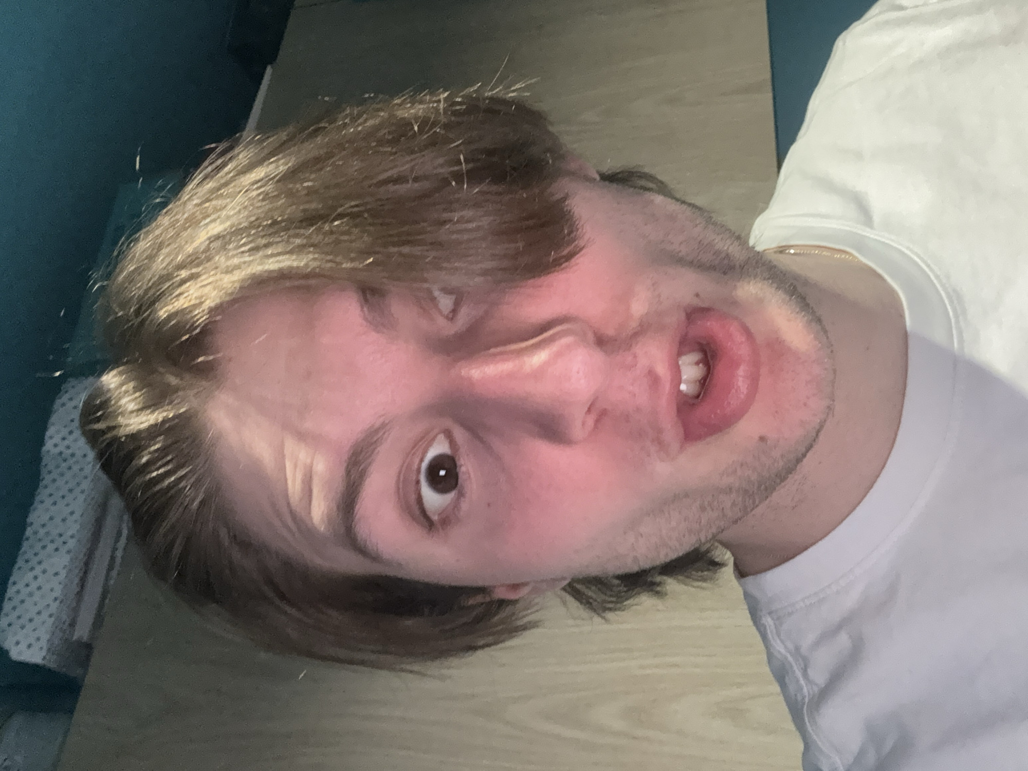 A close-up, tilted self-portrait shows a young man with light brown hair and a white t-shirt