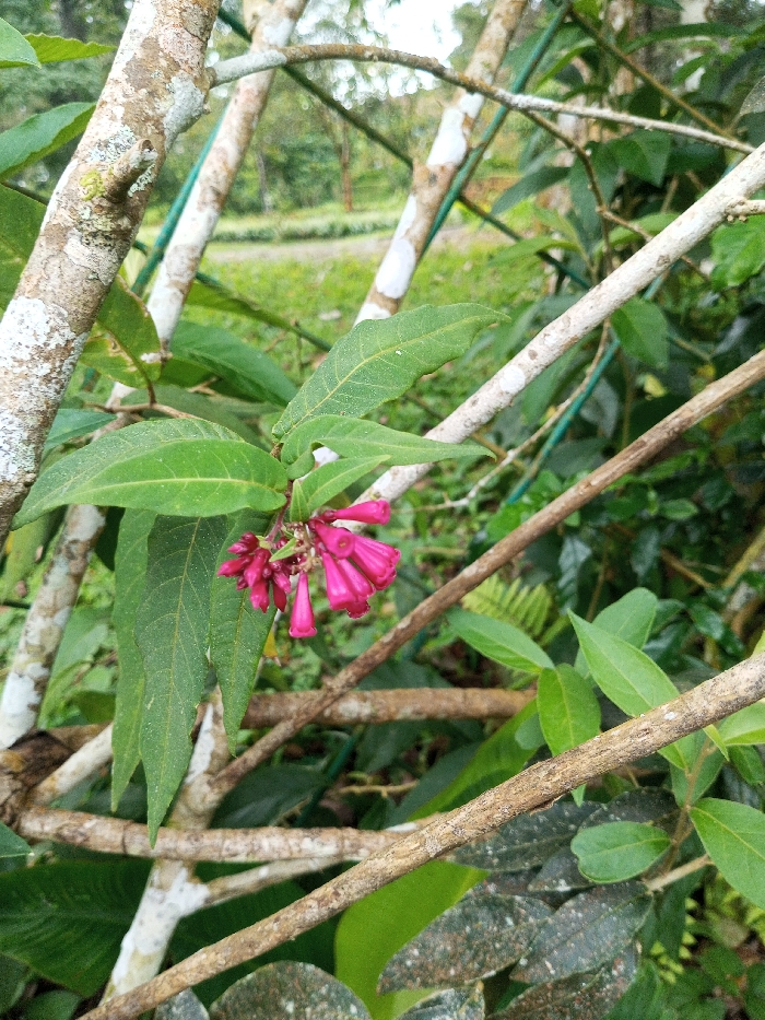 The image displays a close-up botanical study of a flowering plant situated in Pachmarhi, India. The primary subject is a cluster of approximately seven to nine vivid fuchsia-pink, bell-shaped flowers, some fully open and others appearing as buds, emanating from a central point. These flowers are surrounded by multiple dark green, oval-shaped leaves exhibiting visible venation. The foreground is composed of several intertwining tree branches; some are thick with light brown bark mottled by distinct white patches, possibly lichen, while others are thinner and darker brown. A slender, vertical green support pole is partially visible in the blurred midground, integrated with the foliage. The background is a soft-focus expanse of lush green vegetation, including distant trees and a grassy area, illuminated by natural, diffused daylight. No human presence or definitive man-made structures are evident within the scene.