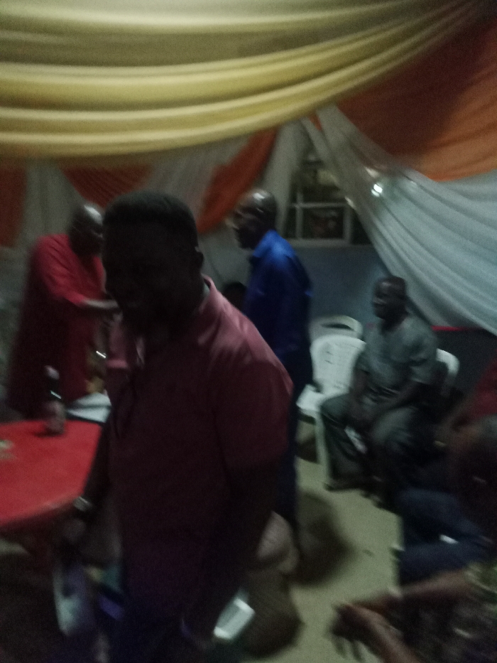 The image depicts an indoor gathering at an unidentified location in Unknown, Unknown. Approximately five to seven adult males are present in a dimly lit room with walls and ceiling draped in yellow/gold, orange, and white fabric. In the immediate foreground, an individual, heavily shadowed, wears a dark pink polo shirt and faces slightly away from the camera, obscuring part of the scene. To their left, a man in a red garment stands near a red rectangular table on which a dark bottle is visible. To the right of the foreground figure, a man with a bald or very short-haired head wears a blue shirt and stands facing the right. Further back on the right, another man, dressed in a grey top and dark trousers, is seated on a white plastic chair, looking to the right. The lower body of another individual is partially visible in the bottom right corner. A window or framed object on the rear wall is partially obscured by the decorative drapes. The scene appears to be a social event or gathering. The image is blurry, indicative of low light conditions and/or motion during capture.