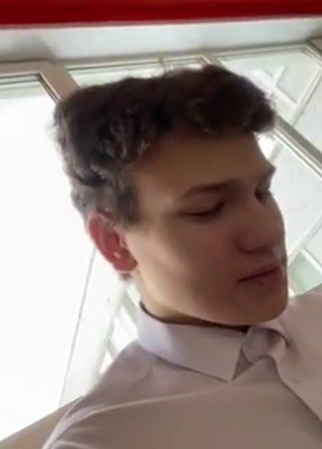 A young man with short, dark curly hair and fair skin is eating. He is wearing a white collared shirt and is seated near a window with visible horizontal panes. Above him, there's a red ceiling element. The camera angle is low, looking upwards at him.
