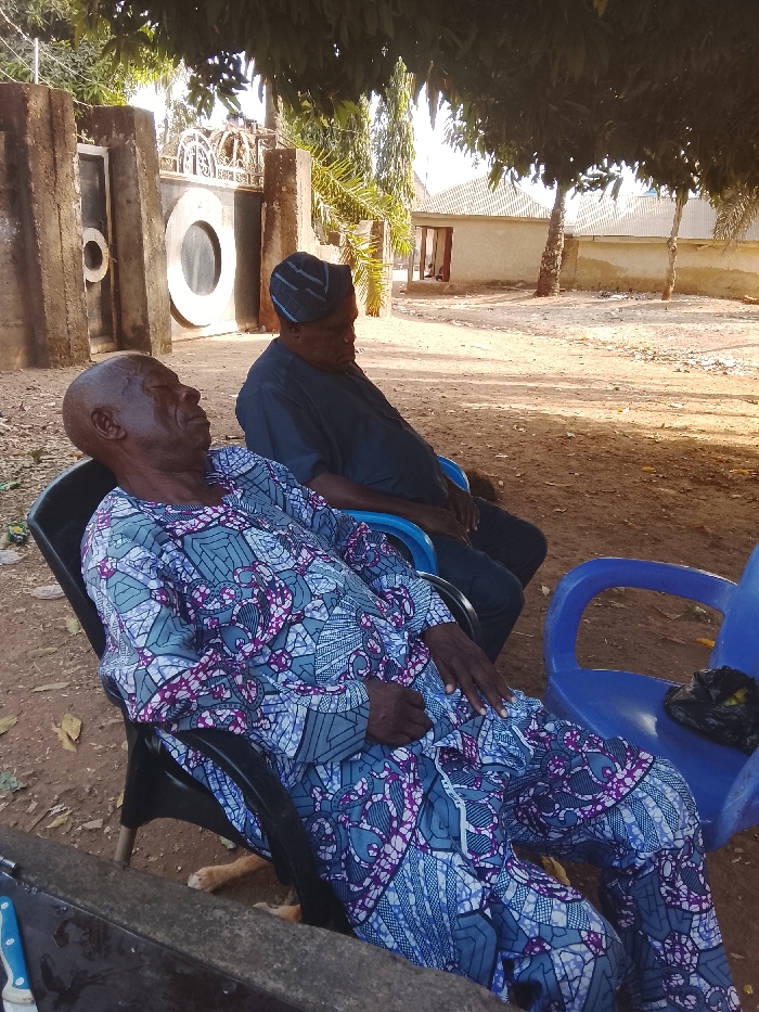 The image depicts an outdoor scene in Akwanga, Nigeria, featuring two adult males resting. In the foreground, an older male with dark skin and a bald head is seated in a black plastic chair, appearing to be asleep or resting with his eyes closed. He wears a long-sleeved patterned garment in shades of blue, purple, and white. His hands rest on his lap. Behind him and slightly to the right, a second male, also with dark skin, is seated in a blue plastic chair. He wears a dark traditional cap and a dark-colored traditional outfit, looking towards the right with his eyes partially closed. To the far right, a third, unoccupied blue plastic chair holds a small black plastic bag containing a yellow object. The ground consists of reddish-brown dirt. In the background, a decorative concrete gate with circular motifs and metalwork is visible, alongside sparse vegetation, including several trees providing shade overhead. A small, light-colored building with a brown door is seen further in the background. A light-colored, possibly concrete, surface is partially visible in the bottom left foreground, and a paw from a small animal is visible beneath the black chair. The scene is illuminated by bright daylight.
