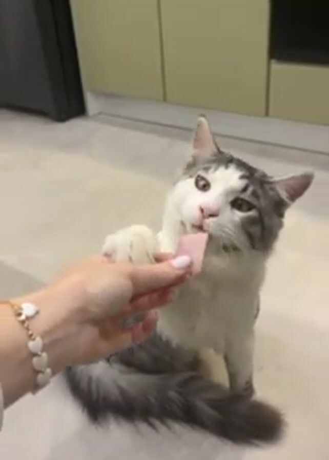 - "A person holding a slice of ham is feeding a gray and white cat" by FM-ewVLI2, licensed under CC BY 4.0