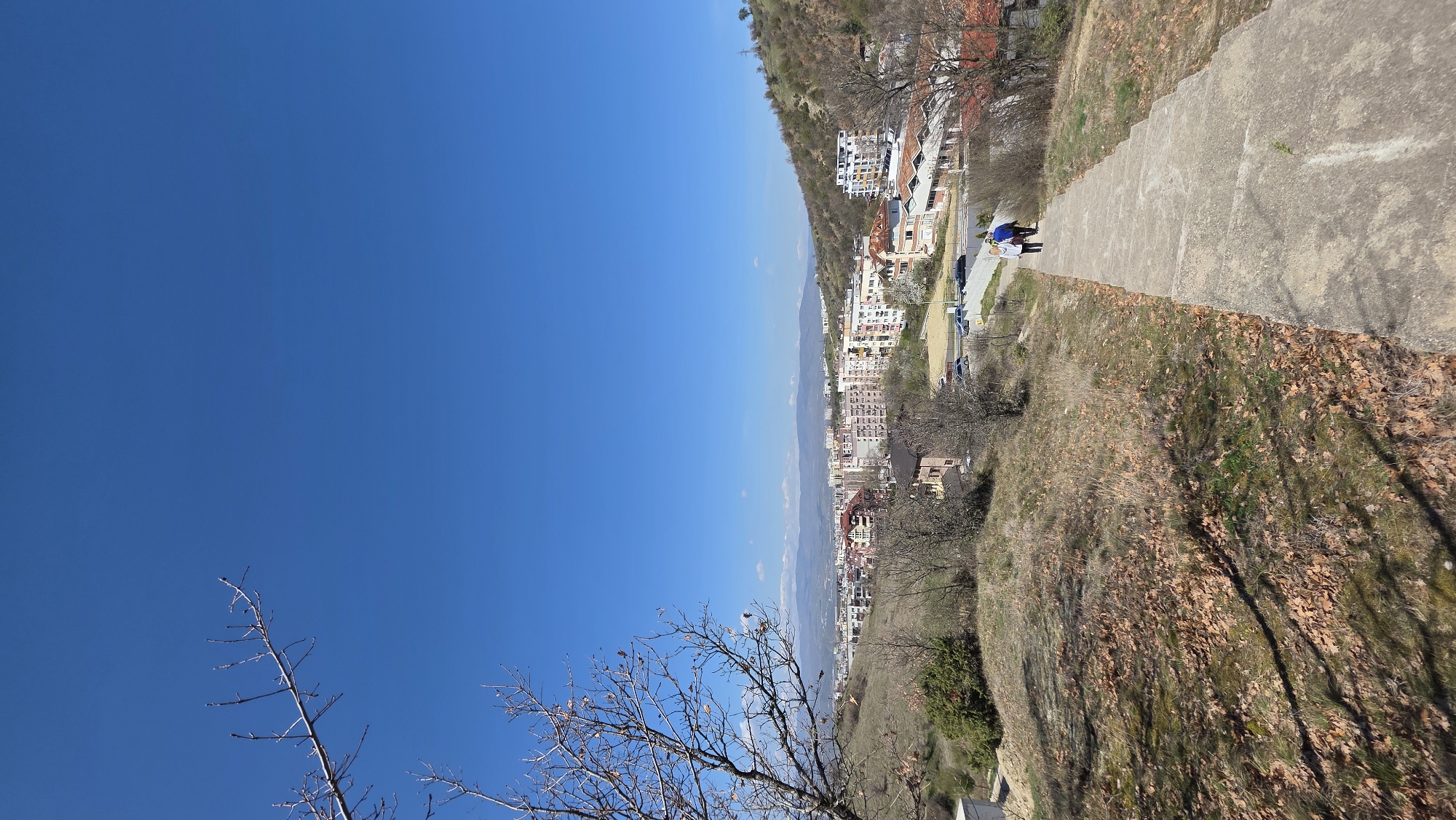 view overlooking the city of Marulevo, Bulgaria. The camera angle is looking slightly downward from a high vantage point. A clear blue sky dominates the left portion of the frame. In the middle ground, a densely populated urban area with mid-rise buildings is visible, suggesting a residential or mixed-use development. A mountain range is faintly visible in the distance beyond the city. To the right, a concrete pathway or set of stairs leads downward, parallel to a steep, vegetation-covered slope. Two individuals are walking along the path. The slope is covered with dry grass and fallen leaves. Bare trees are visible in the foreground.