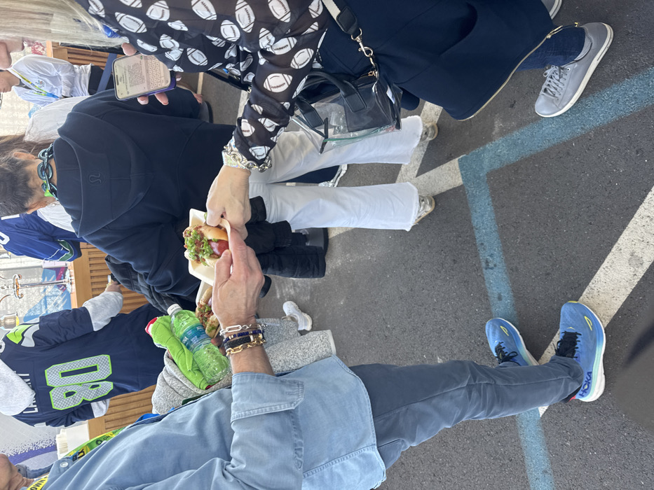 A group of people are gathered outdoors, some seated. One person is wearing a black and white patterned blouse and white pants. Another wears blue jeans and blue sneakers. A third individual has on a Seattle Seahawks jersey with the number "08". Someone is holding two hotdogs in wooden trays, and water bottles are visible. The scene takes place on asphalt marked with blue parking space lines.
