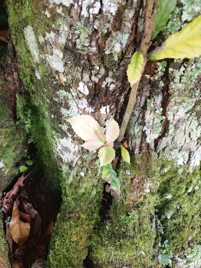 A close-up reveals a tree trunk heavily covered in moss and lichen. The bark is textured with crevices and variations in color. A thin branch emerges from the trunk, sporting several yellowed leaves. A cluster of lighter-colored leaves, tinged with pink at the tips, grows directly from the trunk itself. Fallen leaves are visible at the base of the trunk.
