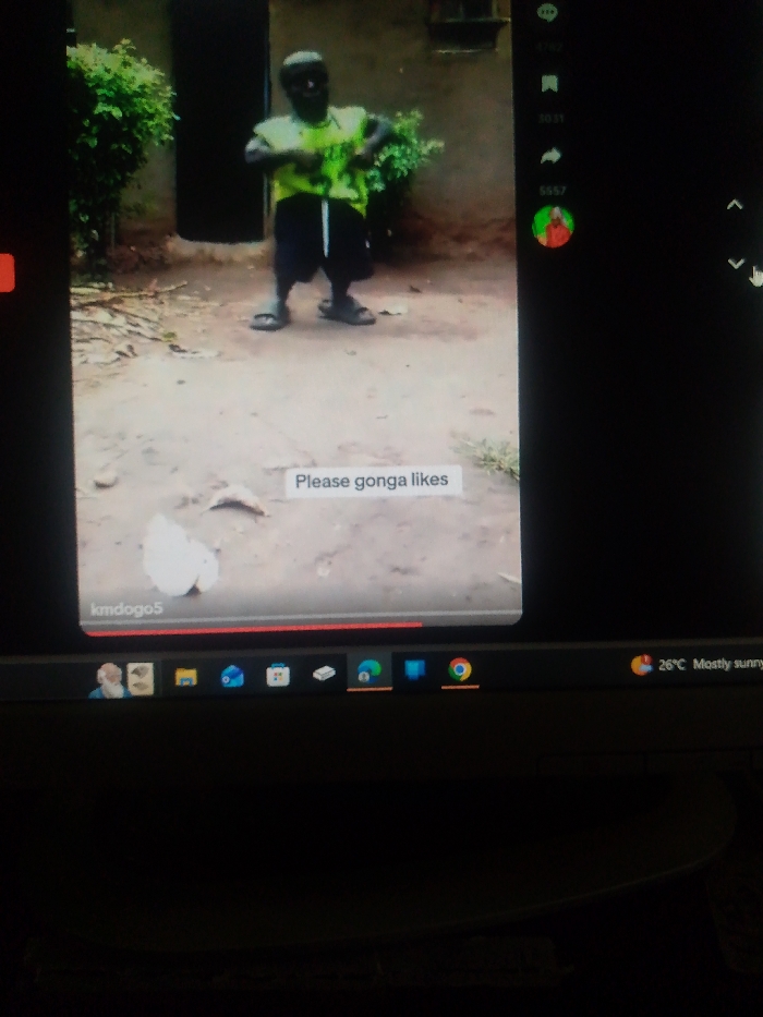 A digital image captures a computer screen displaying a video clip, located in Ndeiya, Kenya. The video features a male individual of short stature, standing centrally on a bare earth surface. He wears a lime-green sleeveless shirt, black shorts with a white drawstring, and dark sandals. His arms are bent at the elbows, with hands positioned near the upper torso, suggesting a pose or dance. The background consists of green foliage on the left and right, and a light-colored building with a dark, rectangular opening behind the subject. Scattered debris, including a distinct white object, is visible on the ground. An overlaid text box in the video reads "Please gonga likes," and a username "kmdogo5" is displayed. The computer screen's interface shows video platform elements on the right, including numerical counts and profile icons. The Windows taskbar is visible at the bottom, displaying application icons and a weather notification indicating "26°C Mostly sunny."