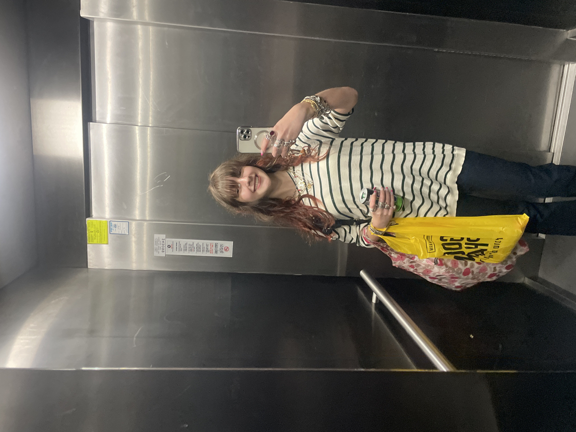 A young person with long brown hair and bangs is taking a selfie in an elevator. The person is wearing a striped shirt, dark pants, and numerous rings and bracelets. They are holding a phone in their right hand and a green and silver can in their left. They also have a yellow bag. The interior of the elevator appears to be made of stainless steel and dark metal. Elevator signage is visible. The photograph was taken in Raanana, Israel.