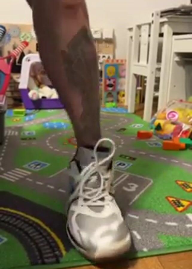 A person stands on a colorful road-themed rug in a child's play area. They are wearing a white and silver Asics wrestling shoe on their left foot. A tattoo is visible on their lower leg and another one is seen on their left arm. The background is filled with children's toys, including a purple pet carrier with a white stuffed animal inside, a table, and educational toys. The person's hand is shown in front of the shoe and the sound of a compressed air can being sprayed can be heard.