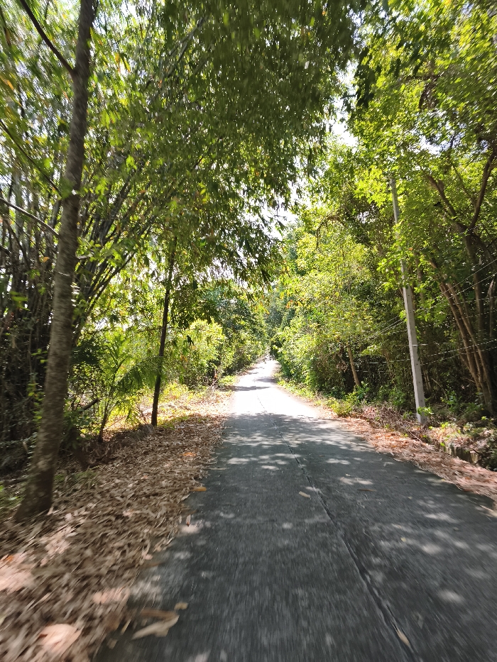 A gray paved road stretches through a lush, green forest. Sunlight filters through the dense canopy, creating dappled shadows on the road surface. Trees and bamboo stalks line both sides, their leaves forming a natural tunnel. A power pole is visible on the right. Dry leaves and vegetation cover the ground beside the road. The perspective suggests movement along the path.