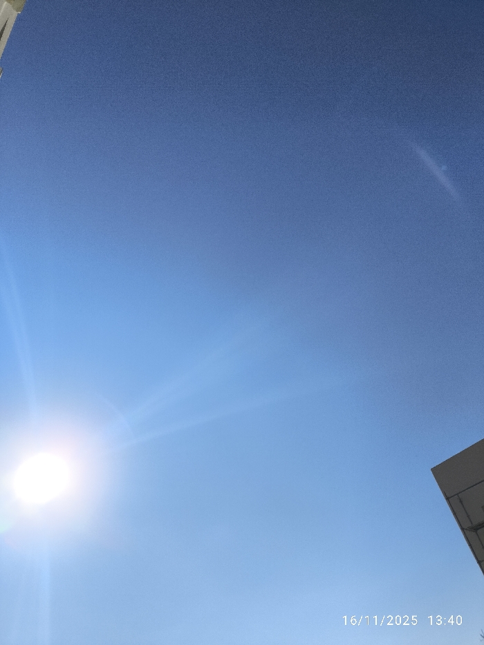 The image presents a bright, unclouded blue sky, identified as being in Nicosia, Northern Cyprus / Cyprus. The sun, a brilliant white circular light source, is positioned in the lower-left quadrant of the frame, emitting strong lens flare with distinct rays. Along the extreme upper-right edge, a small, angular portion of a light-colored building or architectural structure is visible. A faint, elongated, lighter streak is discernible within the upper-right sky, possibly a distant contrail or a camera artifact. A digital timestamp "16/11/2025 13:40" is overlaid in the lower-right corner. There are no individuals, discernible actions, or interactions depicted. The environment indicates clear, sunny daytime conditions.