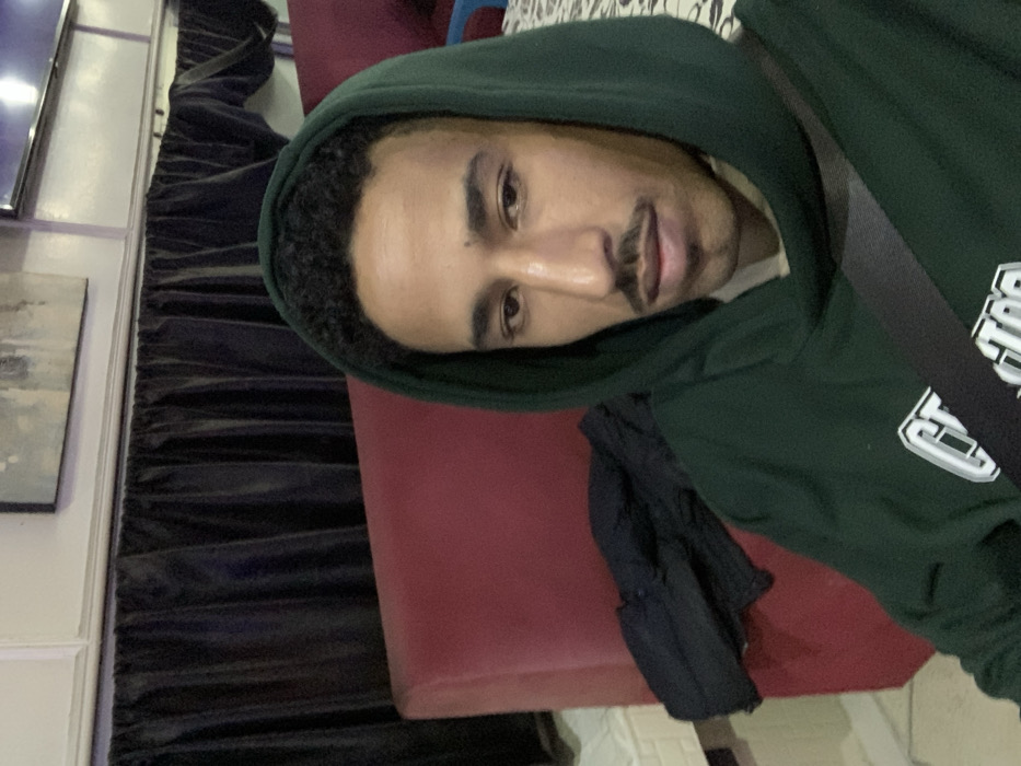 A man with dark hair and a mustache wears a green hooded sweatshirt. He is seated on a red bench or seat. He is also wearing a seatbelt. Part of a TV or monitor, black curtain, and a framed picture can be seen in the background. The photo has been rotated slightly.