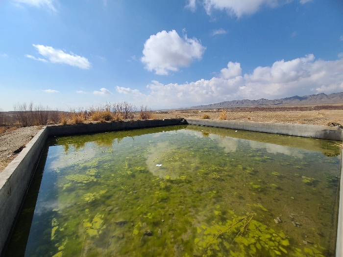 A rectangular concrete pool filled with green, algae-covered water dominates the foreground. Dry vegetation surrounds the pool's edge, transitioning into a vast, flat landscape with distant mountains under a blue sky dotted with fluffy white clouds. The reflection of the sky and clouds is visible on the pool's surface, adding depth to the image.