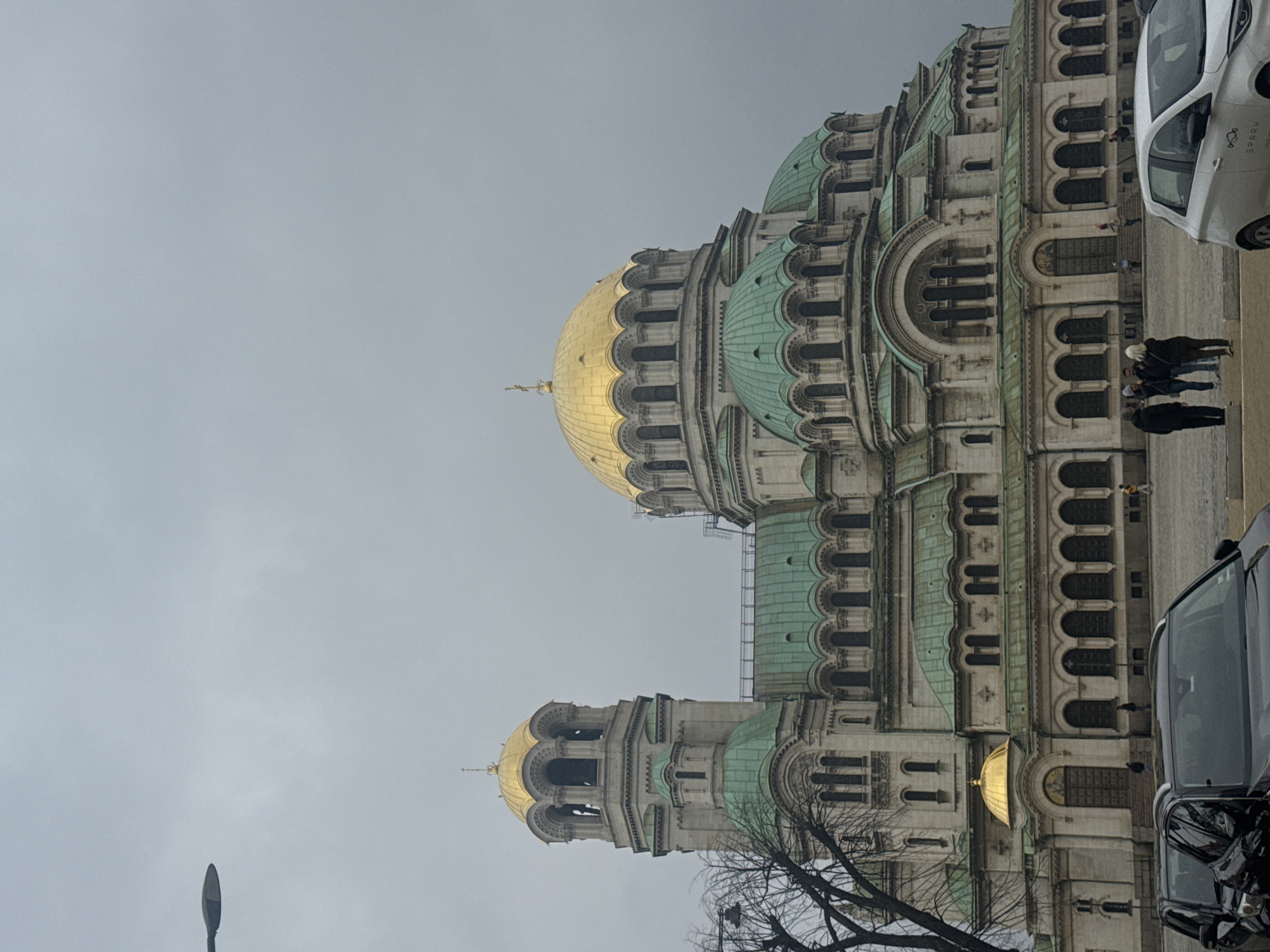 The image captures the Alexander Nevsky Cathedral in Sofia, Bulgaria, viewed from a ground-level perspective on a cloudy day. The cathedral’s architecture features multiple domes with a distinct golden hue. The surrounding buildings are light-colored and ornate, with detailed architectural elements. A few people are walking in the foreground and parked cars are visible on the right side of the frame. A bare tree stands partially visible in the lower right corner.