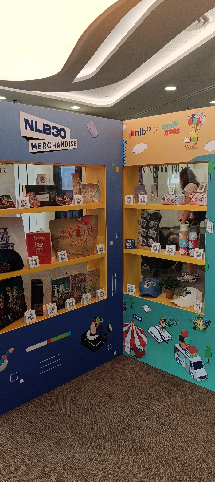 A display of NLB30 merchandise is presented in a corner setting. The left side, labeled "NLB30 MERCHANDISE," showcases items like notebooks, maps, and a tote bag with Chinese characters, each accompanied by a QR code. The right side, titled "nlb30 x BOOK BUGS," features items like keychains, purses, thermoses, and hats, also with QR codes. The walls are decorated with illustrations; the left has drawings of a person using a tablet, while the right has a circus tent, an ice cream truck, and creatures reading. The floor is covered in a brown carpet.