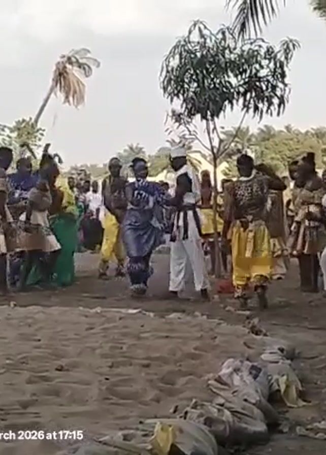 A group of individuals is performing a traditional dance in an outdoor setting. They are dressed in a variety of colorful costumes, some with elaborate headwear. The dance appears to involve intricate steps and coordination. The location is a sandy area with scattered trash, suggesting an open space. In the background, a crowd of people is observing the performance. Palm trees and other vegetation are also visible. The footage is from a mobile device, specifically an OPPO A78, and the timestamp indicates March 25, 2026, at 17:15.