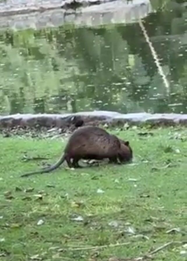 coypu (also known as a nutria) foraging in a grassy area next to a pond. The coypu is brown and has a long, rat-like tail. It is standing on all fours and appears to be nibbling at the grass. The pond behind the coypu is surrounded by a stone border and has reflections of trees and foliage on its surface.