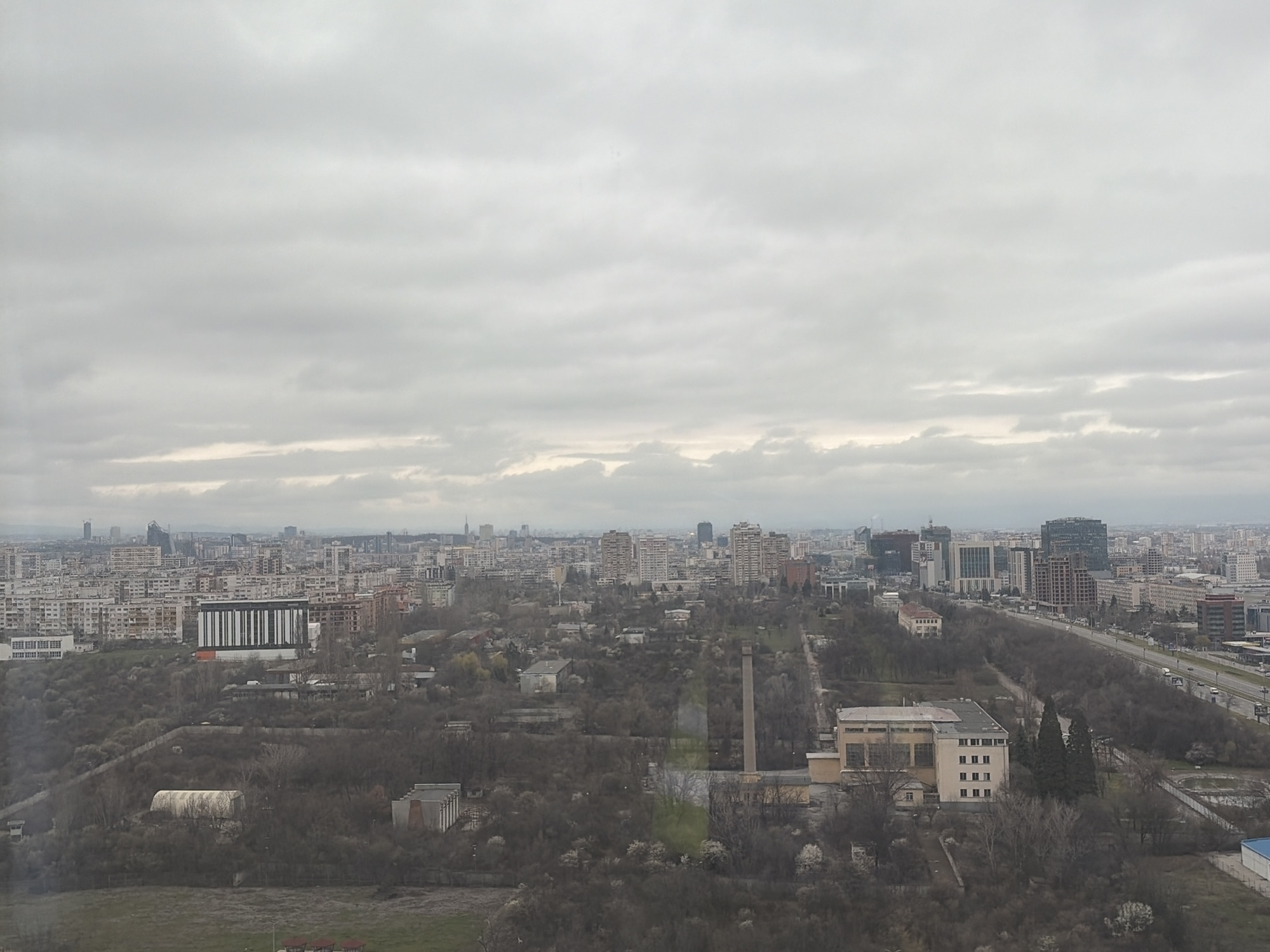 The image depicts an overcast view of Sofia, Bulgaria. The foreground is dominated by a park-like area with sparse vegetation, likely trees and shrubs in a dormant state. Several buildings of varying sizes and architectural styles are scattered throughout this area. Some appear to be industrial or utility buildings, while others seem to be residential or institutional. A tall chimney is visible amidst the trees. Beyond the parkland, the urban landscape unfolds. A multi-lane highway runs parallel to the park, with visible traffic. The cityscape is characterized by a mix of low-rise and high-rise buildings, including residential blocks, office towers, and other commercial structures. The sky is heavily clouded, providing diffused light. The photograph appears to have been taken from an elevated viewpoint, such as a high-rise building or a hill overlooking the city. There is no human presence or animal life immediately apparent in the scene.
