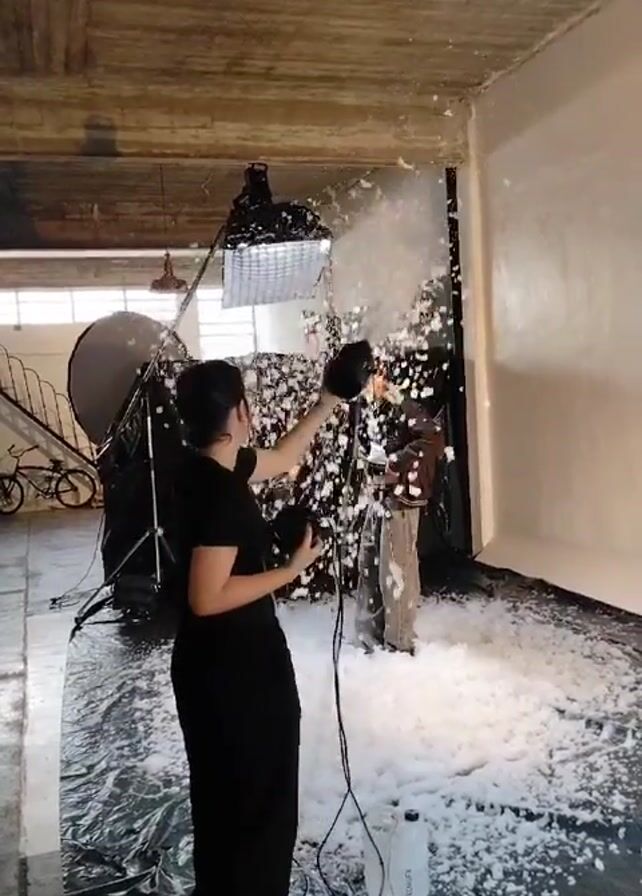 A person in black clothes, holding a black nozzle attached to a cord and a machine, is spraying a white substance that looks like snow onto a man. The man is standing in front of a white backdrop, wearing brown jacket. The floor is covered in the same white substance and a black tarp. There is photography equipment in the background, including a large light with a diffuser, and a bicycle leaning against a wall. The room has a concrete ceiling with visible pipes and light fixtures. There are two bottles on the floor next to the machine.
