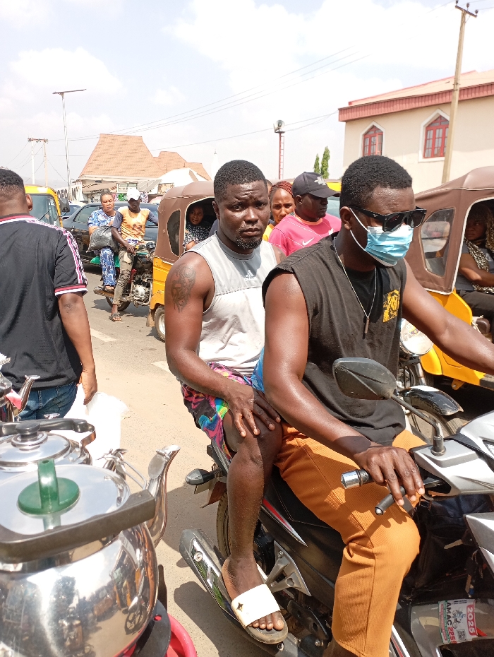 The image presents a daytime urban street scene in Karu, Nigeria, characterized by vehicular and pedestrian activity. In the immediate foreground on the left, two large, polished metallic teapots with black and green plastic accents are positioned, suggesting a street vendor's setup. Centrally, two dark-skinned males occupy a silver and black scooter. The driver, wearing a black sleeveless shirt, dark sunglasses, and a light blue medical mask, holds the handlebars and is dressed in orange-brown trousers. The pillion passenger, wearing a grey sleeveless shirt, colorful patterned shorts, and white slide sandals, looks directly at the camera with his left hand resting on his thigh. The midground features multiple individuals and various vehicles, including several brown-canopied motorized tricycles ("Keke Napep") transporting passengers, and other motorcycles. A man in a black t-shirt with white striped sleeves is partially visible on the far left. The background reveals urban architecture with reddish-brown tiled roofs and painted walls, some featuring red-framed windows, beneath a bright sky with scattered clouds. Utility poles and overhead wiring are also present. The scene indicates congested or slow-moving traffic.