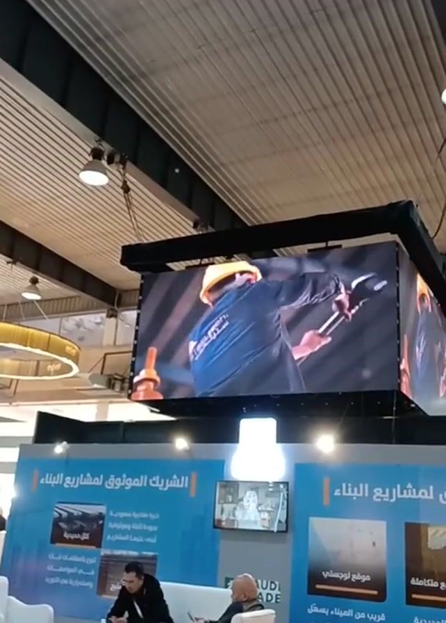 booth at an exhibition with a large LED screen hanging above. The screen displays images of a worker in a hard hat and construction-related visuals. Two men are sitting on a white couch in front of the booth, both looking at their phones. The booth has blue panels with white text in Arabic, promoting "reliable building partners" and highlighting location, supply chain, and other benefits. The environment is an indoor exhibition space with a high, corrugated metal ceiling and overhead lighting.