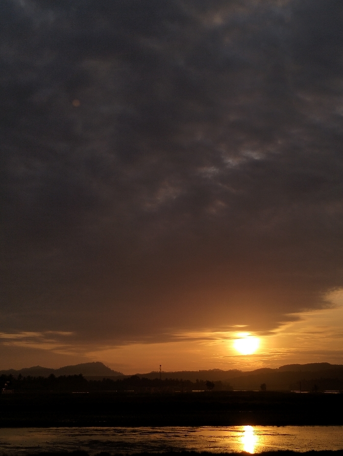 A dusky sky heavy with dark clouds dominates the view, hinting at a coming storm or the end of the day. Below, the sun breaks through the clouds, casting a warm, golden glow upon the horizon. The light reflects on a body of water, creating a shimmering path. Silhouetted hills and distant structures are visible, adding depth to the tranquil yet ominous scene.