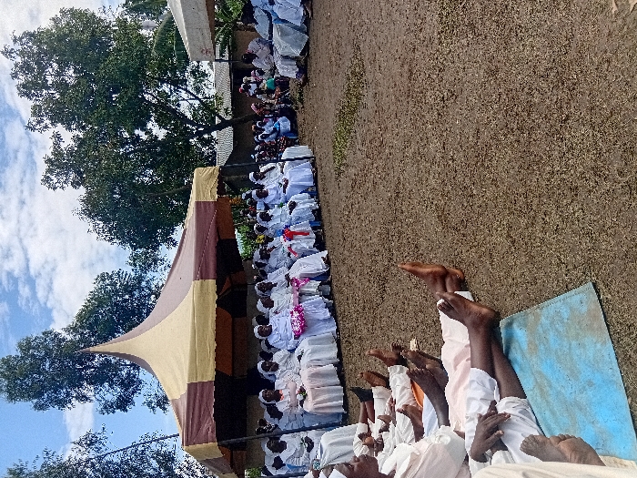 The image depicts an outdoor gathering in Chevaywa ward, Kenya. Numerous individuals, primarily adults, are assembled in an open area. In the mid-ground, a large group is seated on chairs under a prominent, pointed tent constructed of alternating brown and beige fabric panels. The majority of these individuals are dressed in white or light-colored robes, with some wearing white head coverings. Decorative elements, including a pink floral arrangement and blue and white ribbons, are visible on chairs within this seated group. To the far right, additional individuals in light-colored attire are seated, partially under a smaller white canopy. In the foreground, several individuals are seated directly on the bare earth or on a light blue mat, with their legs extended forward and feet bare. The ground surface consists predominantly of dry, bare earth with sparse patches of green vegetation. The background features large green trees under a partly cloudy blue sky, with some simple structures, including those with corrugated iron roofs, visible behind the gathering.