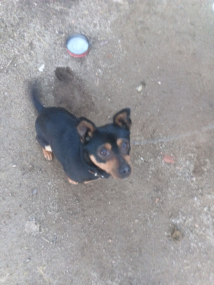 The scene depicts a small dog standing on a dirt and gravel surface in Birkova, Bulgaria. The dog is primarily black with distinct tan markings on its muzzle, above its eyes, on its chest, and on its paws. It wears a dark-colored collar around its neck. The dog is positioned facing slightly right relative to the camera, with its head tilted upwards, gazing directly towards the viewer. To the dog's left, a partial shadow is visible on the ground. Approximately one meter behind and to the left of the dog, a small, round, silver-colored container with a red rim rests on the ground. The ground itself is composed of light brown to grey earth and small stones, with minor debris scattered throughout the visible area.