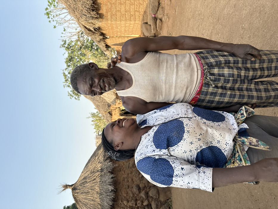 An older man with a tank top and plaid pants smiles at a woman wearing a patterned white and blue shirt. The woman, with a black headband, also smiles broadly. Behind them, a traditional thatched-roof hut is visible in a rural setting. The sky is clear. Both individuals appear to be sharing a joyful moment together.