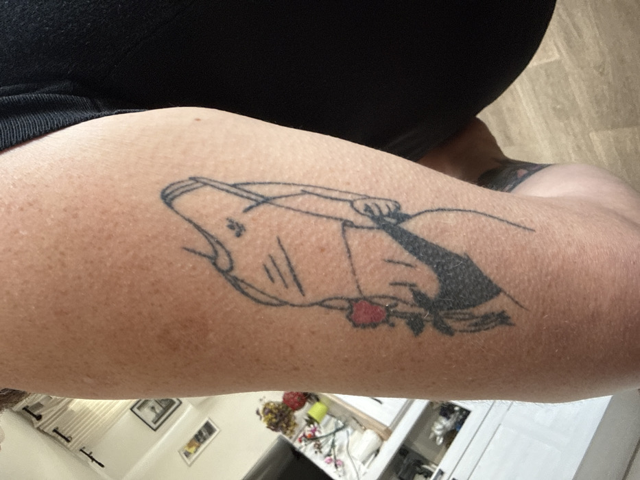 A close-up image captures the upper leg, likely a thigh, of an individual situated indoors in Chantepie, France. The visible skin is fair-toned with discernible pores and some freckling. A black tattoo on the thigh depicts a minimalist outline of a torso, possibly female, wearing a cropped top with a three-stripe design on the visible sleeve and a trefoil logo on the chest, along with solid black bikini bottoms. A hand within the tattoo is positioned to hold a red rose, detailed with a green stem and leaves, near the midsection. The individual is wearing black apparel, likely shorts or pants, visible on the right side of the frame. The background, largely out of focus, reveals a domestic interior with light-colored flooring, a wall displaying framed pictures (one distinctly dark-framed), white furniture, and a vase containing red and white artificial flowers.