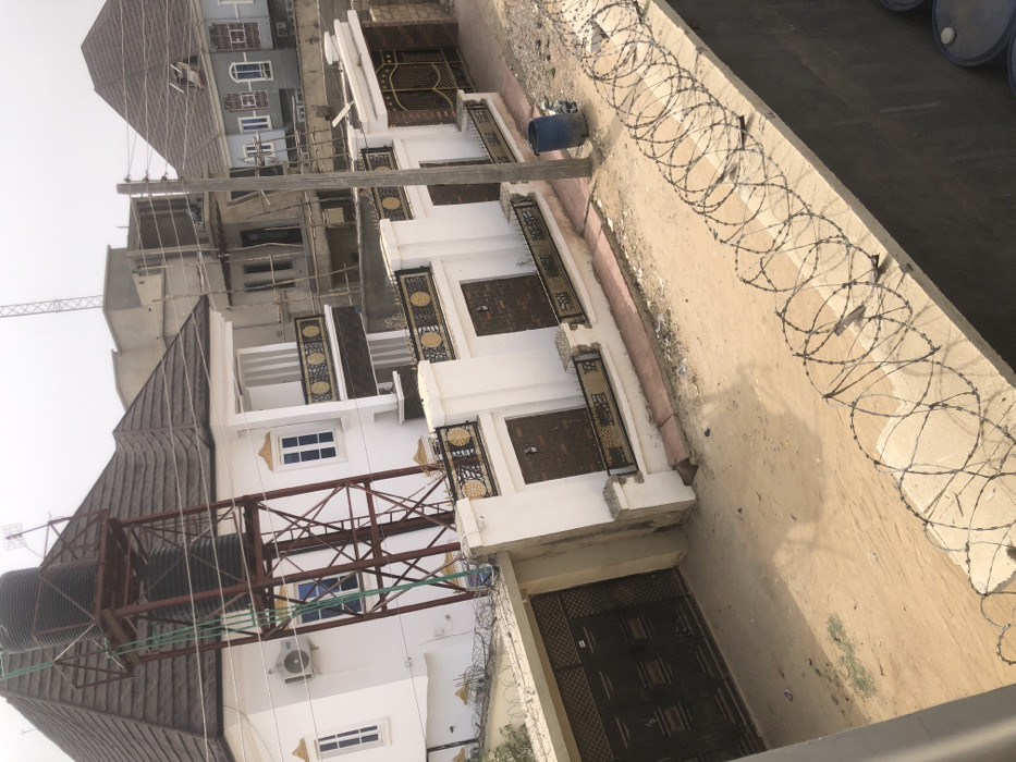 The image depicts a residential streetscape in Aviation Quarters, Nigeria, observed from a slightly elevated vantage point during clear daytime conditions. In the foreground, a concrete wall extends horizontally from the lower-right, topped with several coils of concertina wire. Below this wall on the extreme lower right, parts of multiple blue cylindrical drums are visible. The midground features an unpaved, light brown dirt road. A single blue plastic barrel rests on the side of this road, adjacent to a brown wooden utility pole positioned towards the right side of the frame. Shadows are cast onto the dirt road from an unseen source to the left. The background primarily consists of multiple residential structures. On the left, a prominent two-story white house with a brown tiled roof is visible. This house features white-framed windows with gold trim, an exterior air conditioning unit, and a balcony with black and gold patterned railings. Adjacent to this house, a tall, reddish-brown metal water tank stand supports a black cylindrical water storage tank, with green piping running vertically. The property is enclosed by a white perimeter wall, also adorned with black and gold decorative railings and dark brown brick-like panels. A large, dark brown double gate, topped with barbed wire, is situated on the far left of this property. Behind this white house, a multi-story structure under construction, displaying exposed concrete and scaffolding, is visible. Further to the right in the background, a light blue residential building with a brown tiled roof and white-framed windows is partially visible. No individuals are present in the image. No actions or interactions are depicted. The environment is characteristic of a developing or established residential area with visible security measures and unpaved roads.