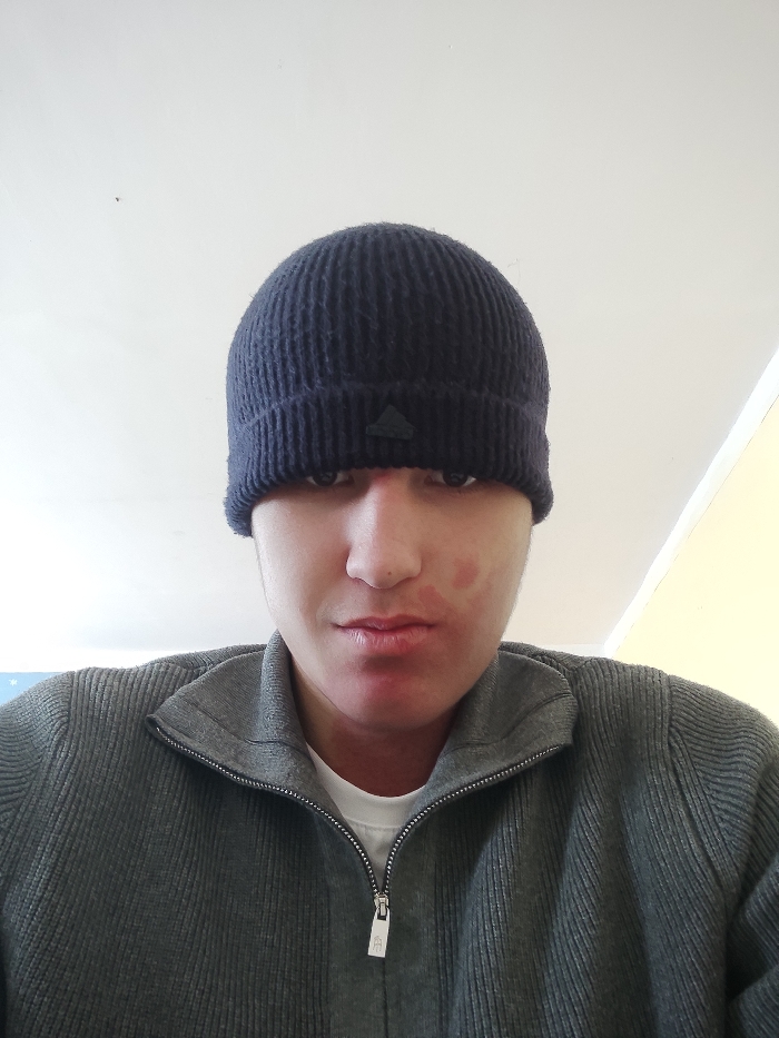 The scene depicts a direct, head-on photographic portrait of an adult male individual, taken in the city of Rishtan, Uzbekistan. The subject is positioned centrally, looking directly into the camera. He wears a dark blue, ribbed knit beanie pulled low, obscuring his forehead and the upper part of his ears. A small, dark, triangular logo, resembling the Adidas brand, is affixed to the front cuff of the beanie. He is clad in a grey, vertically ribbed, zip-up jacket worn over a visible white undershirt. The jacket's metallic zipper is partially open, revealing the white undershirt, and features a rectangular, white zipper pull with an indistinct symbol. The subject's face exhibits several visible marks: a reddish, irregularly shaped patch is present on his right cheek (viewer's left), and general redness is apparent around his chin and lower lip area. A slight red discoloration is also visible on his forehead, partially beneath the beanie. His eyes are dark and visible, fixed forward. His expression is neutral with closed lips. The background consists primarily of a plain, light-colored surface, suggestive of an interior wall or ceiling. The upper left portion of the background is white, containing a small, dark speck. The upper right background shows a white surface with a subtle yellow tint towards the corner, indicating an architectural junction. A faint, light blue pattern is visible in the lower left background, suggesting a decorative element on a wall behind the subject. No other individuals or significant objects are present in the immediate vicinity.