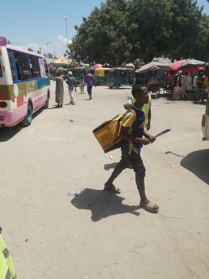 A young boy walks across a dusty lot carrying a yellow bag and a package. He wears a blue and yellow shirt, dark pants, and sandals. In the background, there's a colorful bus, people milling around, and several three-wheeled vehicles. Stalls and awnings provide shade in the distance, and a large tree stands in the background under a bright sky. A discarded plastic bottle lies on the ground near the boy.