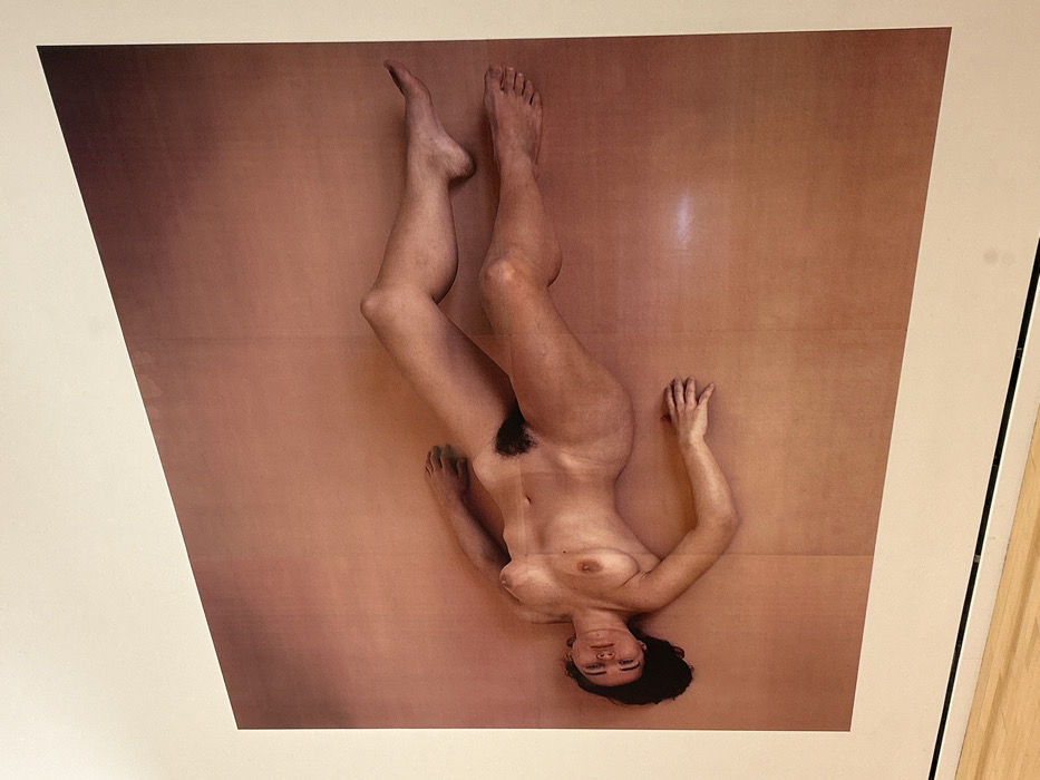 A framed photograph depicts a nude woman lying on a brown surface