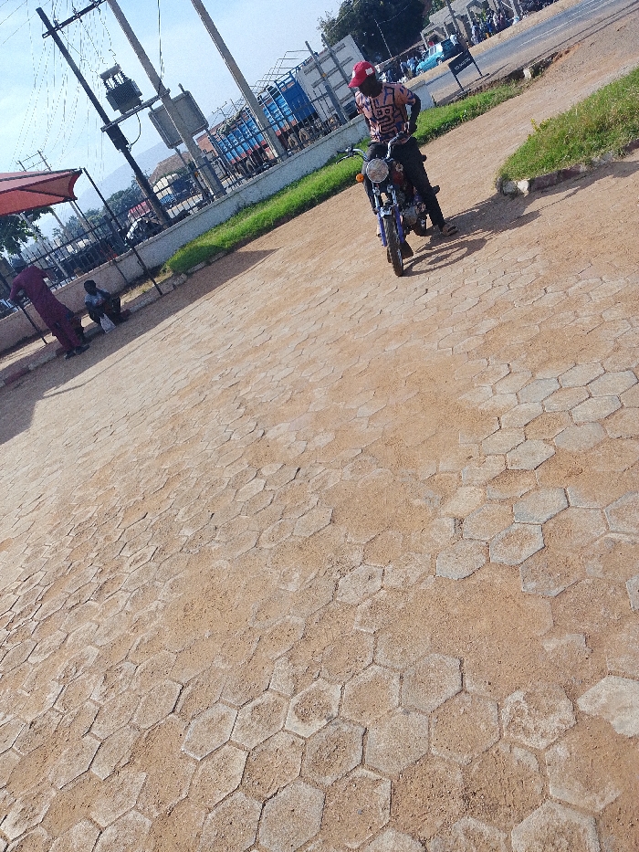 This image depicts a daytime street scene in Akwanga, Nigeria. The primary ground surface is paved with light brown hexagonal interlocking concrete blocks, with dirt accumulated in the gaps. In the foreground-midground right, a male subject wearing a red baseball cap, a patterned long-sleeved shirt (light orange/pink with black designs), dark trousers, and sandals is seated on a blue motorcycle, facing left. In the mid-ground left, under a red fabric canopy, a second male in a dark, possibly purple, traditional garment stands. Adjacent to him, a third male is seated on a low surface, wearing a lighter-colored shirt and dark trousers. A low, light-colored concrete wall topped with green grass separates this paved area from a main road in the background. Multiple commercial trucks and smaller vehicles are visible on this road. Overhead utility poles with a transformer are present in the background-left. Distant mountains are discernible under a clear, bright sky.