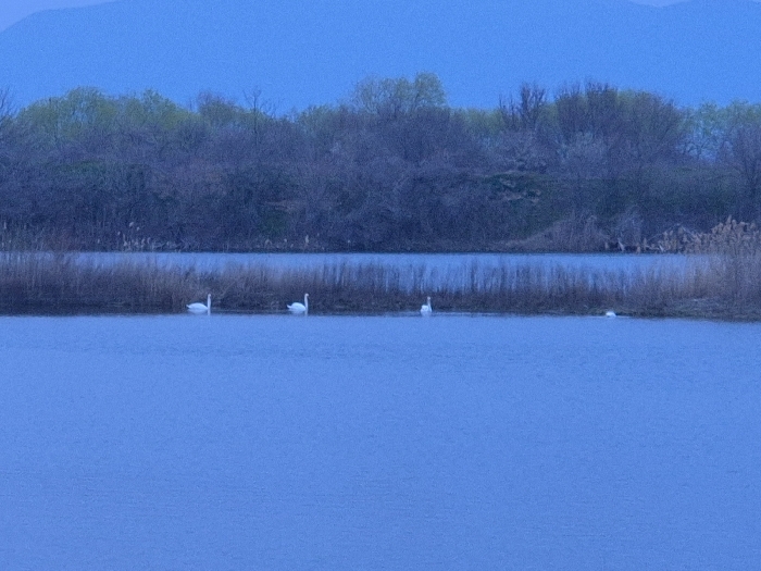 The image portrays an aquatic landscape in Mechkarevo, Bulgaria, observed under ambient blue light, suggesting twilight conditions. The foreground consists of a calm, dark blue body of water. Four white swans are present on this water: two are positioned on the left side, one in the center, and a fourth swan is visible further to the right, appearing partially submerged or with its head lowered. A dense strip of dry, light brown reeds extends horizontally across the midground, separating the primary body of water from a narrower channel immediately behind it. The background features a linear formation of deciduous trees and shrubs, displaying a mix of bare branches and emerging green foliage. Distant, dark blue hills or mountains are discernible against a muted blue sky at the horizon. No human subjects or man-made objects are visible.