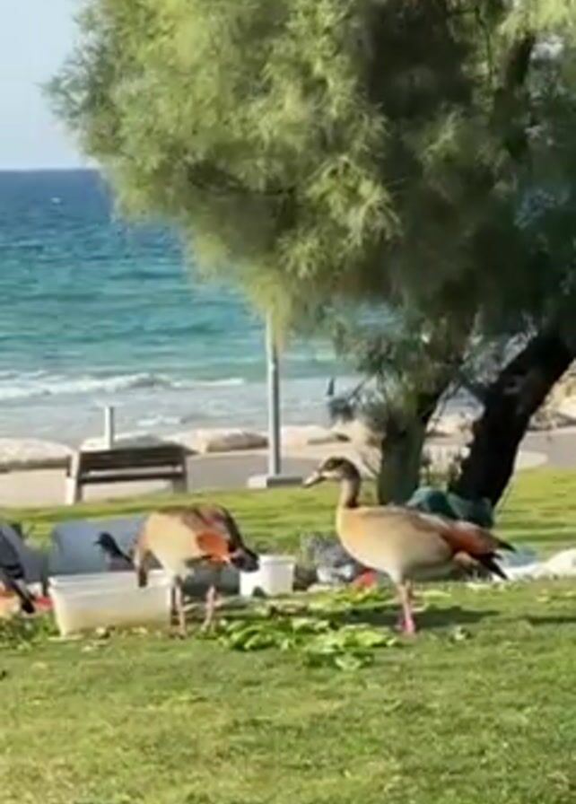 The scene unfolds on a grassy area near a beach, where several Egyptian geese and other birds are feeding. The geese, characterized by their distinctive reddish-brown and grey plumage, are seen pecking at leafy greens scattered on the ground. Near them, there's a white plastic container with more food inside. The sea is visible in the background, with gentle waves lapping against the shore, and a bench and lamp post are stationed on the sidewalk. A leafy tree provides shade to the scene, and a few additional birds, including pigeons, are present around the feeding area. The environment suggests a coastal park or recreational space.