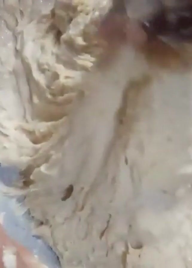 close-up of two dark-skinned hands mixing a large quantity of light tan dough in a silver-colored bowl