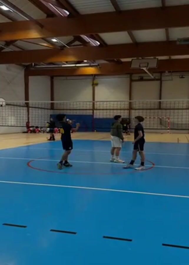 - "three young men standing on a blue volleyball court in an indoor gymnasium with a volleyball net strung up" by FM-UOLoi1, licensed under CC BY 4.0