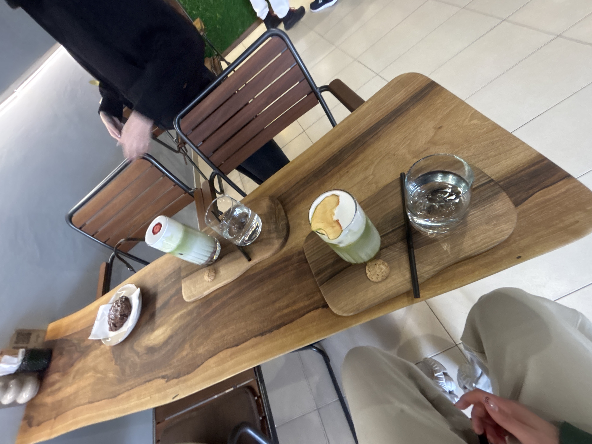 The image displays an interior scene from a cafe or lounge located in Velingrad, Bulgaria, centered on a long, irregular-edged wooden table. Two individuals are partially visible, seated at the table. One person on the right wears a black long-sleeved garment, with their hands resting on the table area. The second person, on the left, wears light-colored pants, with their left hand, featuring light nail polish and a small tattoo, visible. Arranged on the table are two tall clear glasses containing a green-colored beverage, each placed on a small, light-toned wooden serving board. The upper beverage is topped with white foam and a red accent, accompanied by a glass of water containing a black straw and a small cork-like disc. The lower beverage also features white foam, garnished with a dried fruit slice, and is similarly accompanied by a glass of water with a black straw and a cork-like disc. Further along the table, a single dark-colored cookie, dusted with powdered sugar, is presented on a small white oval plate lined with white paper. The immediate environment includes dark metal-framed chairs with wooden slats. The floor consists of light-colored, possibly white or pale gray, square tiles. In the background, a light gray wall is visible, along with decorative elements at the table's far end, including stacked white ceramic objects and a dark container holding napkins. A section of green, artificial grass texture is present on the floor to the far right.