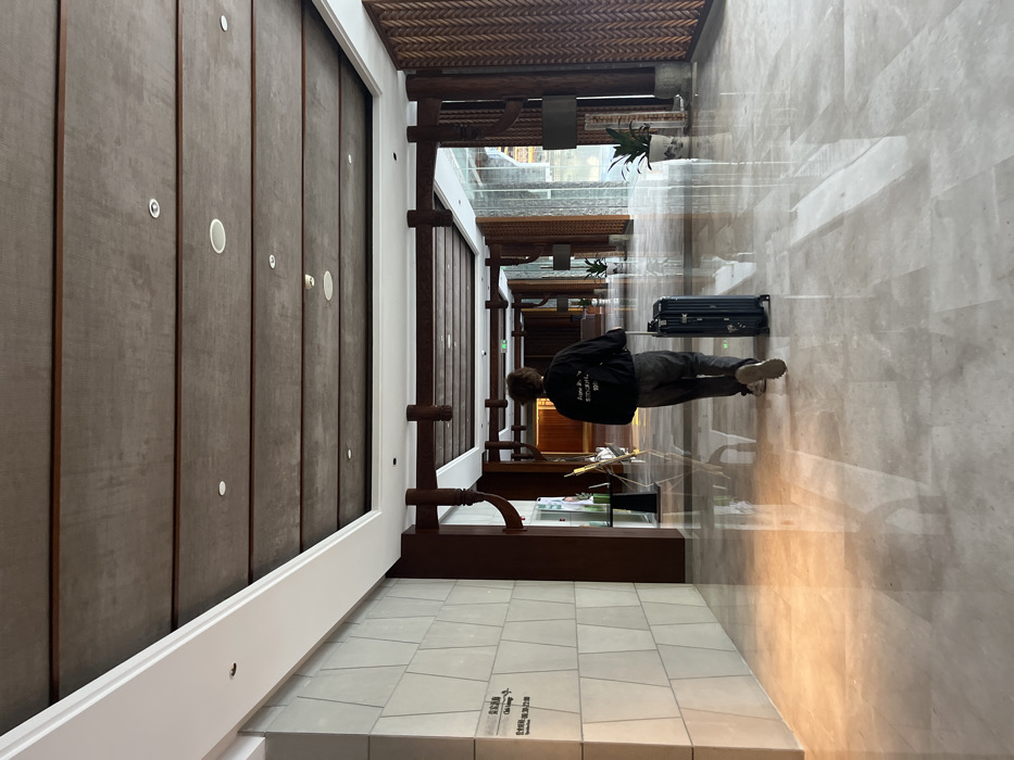 The image depicts a hotel hallway or lobby in Wulingyuan, China. A single individual, seen from behind, walks away from the viewer towards the background of the long corridor. The person has medium-length, curly, light brown hair and is wearing a black bomber jacket with white text on the back (partially visible as "Acne Studios 1996"), dark trousers, and light-colored sneakers. They are pulling a dark-colored, hard-shell rolling suitcase with a silver telescopic handle. The floor is composed of highly polished, light-colored marble or stone tiles, reflecting ambient light and the lower portions of the walls and ceiling. The left wall is paneled with light-colored, possibly textured rectangular tiles. A sign affixed to this wall includes Chinese characters and an arrow pointing left, with English text "Club Lounge" and hours "6:30-22:00". The right wall features dark wooden paneling with decorative woven patterns, interspersed with large glass sections that look out onto another area, possibly an outdoor courtyard or garden, or another part of the building. The ceiling is multi-tiered, with a lighter perimeter and a darker central section composed of textured panels framed by dark wooden beams. Recessed circular light fixtures are visible throughout the ceiling. Dark wooden columns and beams are prominent architectural features, extending along the hallway. Potted green plants in decorative pots are strategically placed along the right side of the corridor, near what appear to be small side tables with dark lamps. The hallway is well-lit by a combination of natural light from the glass sections and artificial light from the recessed fixtures.