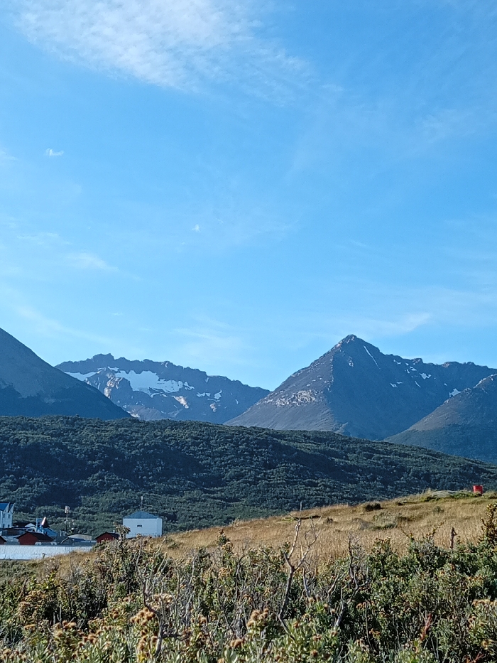 A landscape featuring a clear blue sky with faint wisps of clouds above a series of mountains. The mountain range has varying peaks, some capped with snow. Dense green trees fill the lower slopes, giving way to a field of brown and green vegetation in the foreground. Several white buildings are clustered in the lower left, hinting at a settlement or village. A small red object is on the right side of the grass.