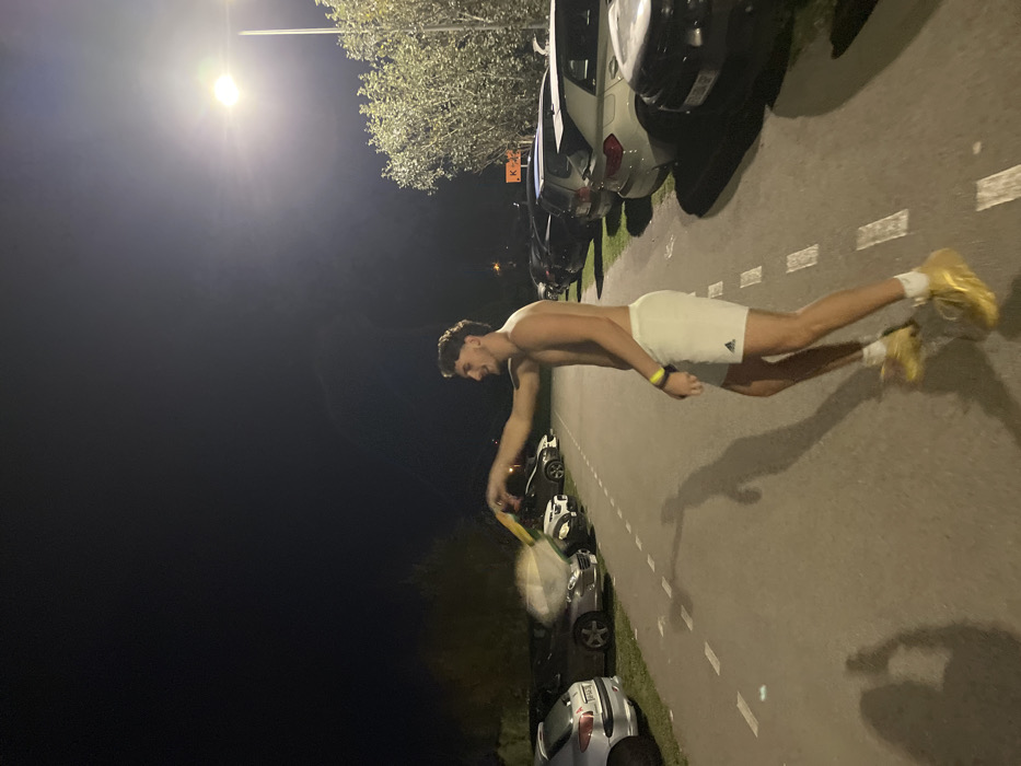 The image depicts a young, shirtless male in mid-motion on a paved surface at night