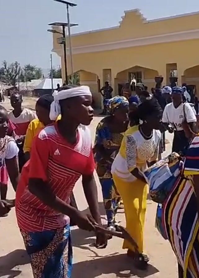 In a medium shot taken outdoors, a diverse group of people is engaged in a dance or procession. The subjects are walking on a dirt road, with a low, light-yellow building with a flat roof and decorative crenellations visible in the background. The sky is bright blue, and the lighting is strong, casting sharp shadows. The group consists of individuals of various ages, including children and adults. Many are wearing colorful, patterned clothing, head coverings, and casual attire such as t-shirts. Some people in the group are carrying or playing small percussion instruments, such as sticks or drums, contributing to an energetic atmosphere. The camera appears to be stationary.