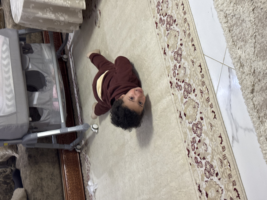 - "A young child in a maroon sweatsuit lies on a patterned rug, looking up at the camera" by FM-wlXxU2, licensed under CC BY 4.0