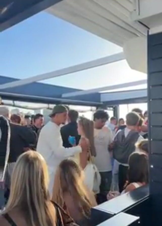 crowded outdoor party on a rooftop with a partial awning. A group of people, mostly young adults, are standing and talking in the sunlight. Many hold drinks. Several individuals can be seen looking at their phones. The camera is positioned in a shaded area, possibly a service area, looking out into the party. The sky is clear and blue.