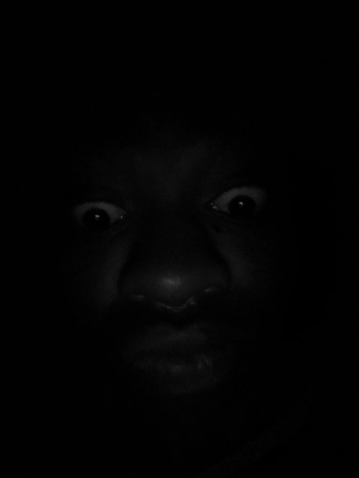 A stark black and white image features a face emerging from deep shadows. The eyes, wide and seemingly staring, catch the faint light, as does the prominent nose. The mouth is partially visible, positioned below the nose. The darkness dominates, shrouding the face and obscuring any surrounding context. The extreme close-up and minimal lighting create an intense, unsettling effect.